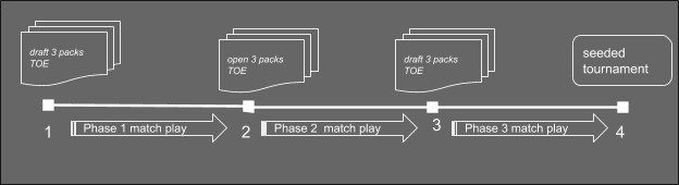 - Phase 3: draft - all cards from Phases 1&2, plus cards from a 3-pack booster draft (TOE)