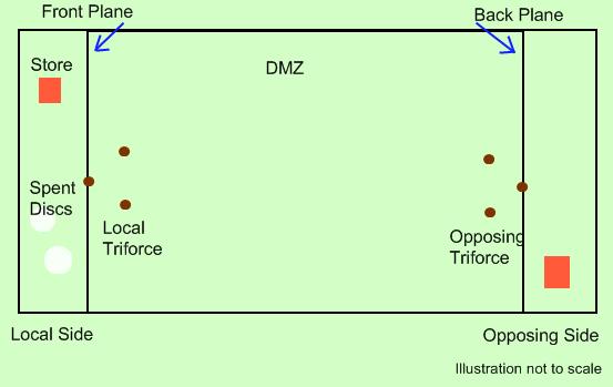 - DMZ: the area of the field between the front and back planes; discs in this area are not to be cleared until throwing is completed. This region's width is not specifically limited, although it need not be any larger than the arc a disc may take at a height of 6 feet from the ground and still return to the proximity of the opposing triforce.